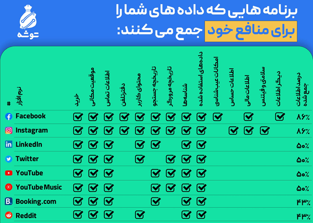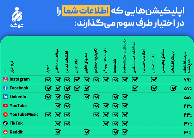 اپها میتوانند هرگونه اطلاعات شامل اطلاعات شخصی، تاریخچه جستجو و وبگردی شما را برای تحلیل و شناسایی و ثبت اطلاعات برای خودشان یا اپهای دیگر جمعآوری کرده و به اشتراک بگذارند.